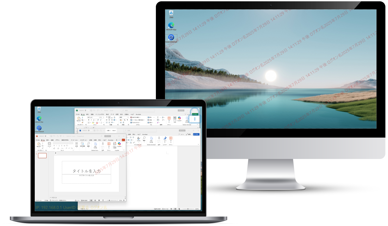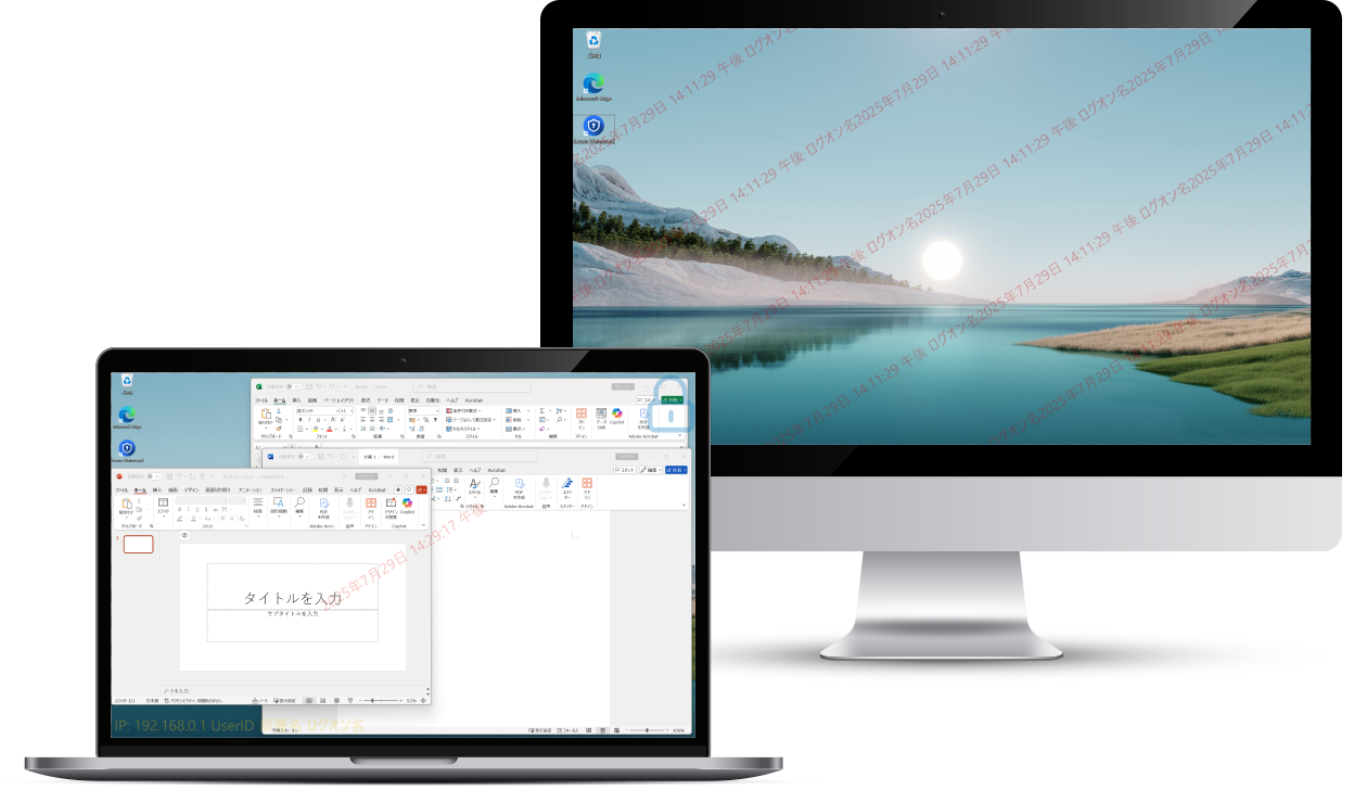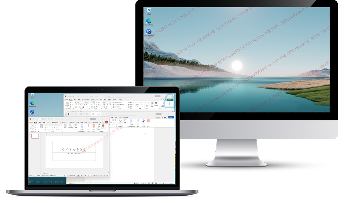 ウォーターマーク表示 - PC画面にユーザー名やIPアドレス、日時を含む透かしを常時表示。社内外での画面キャプチャや覗き見に対し、視覚的な抑止効果を発揮します。