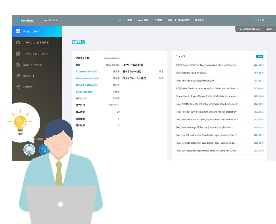 - 管理者はユーザー/端末ごとのウォーターマーク状態、接続履歴、セキュリティイベントを確認可能